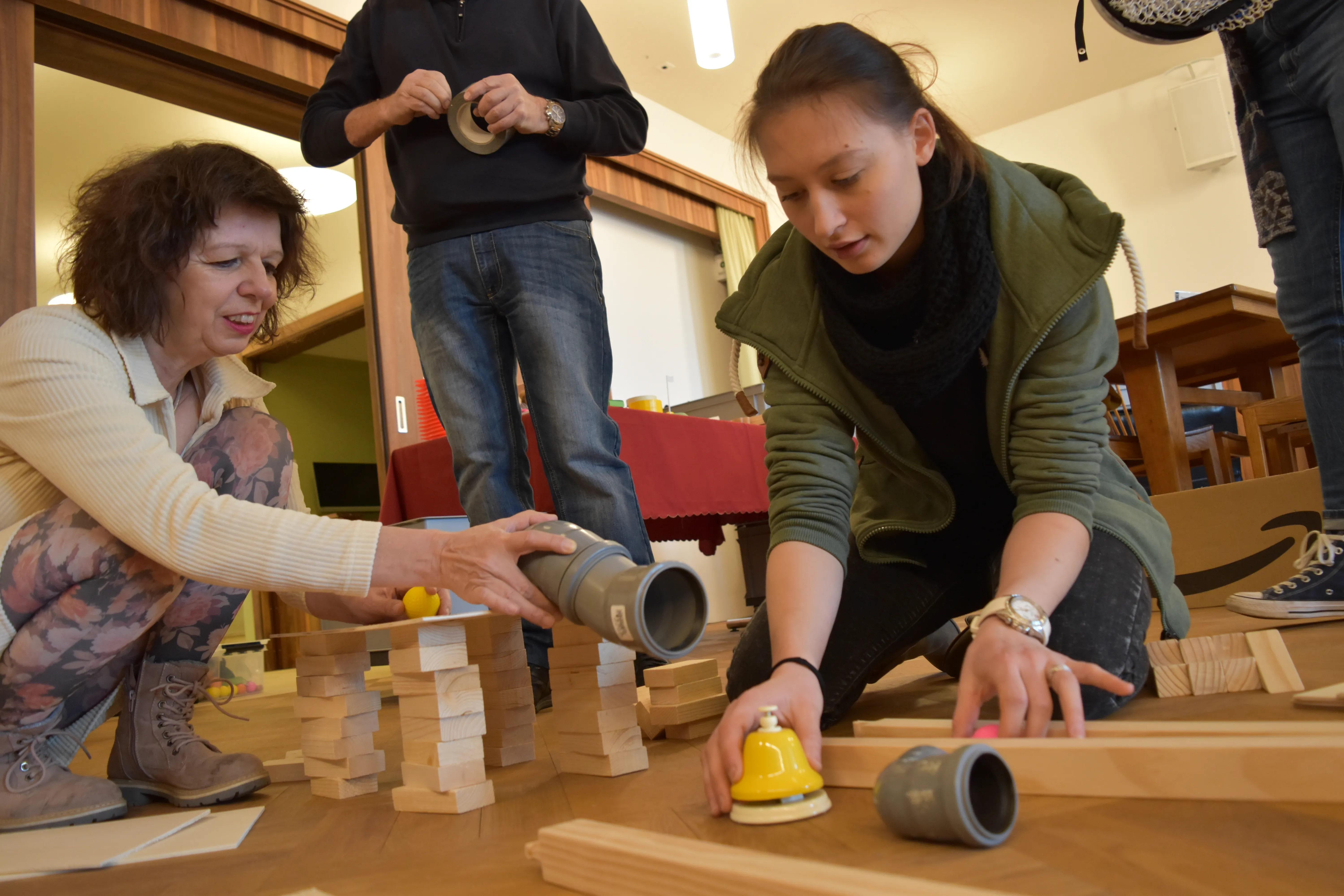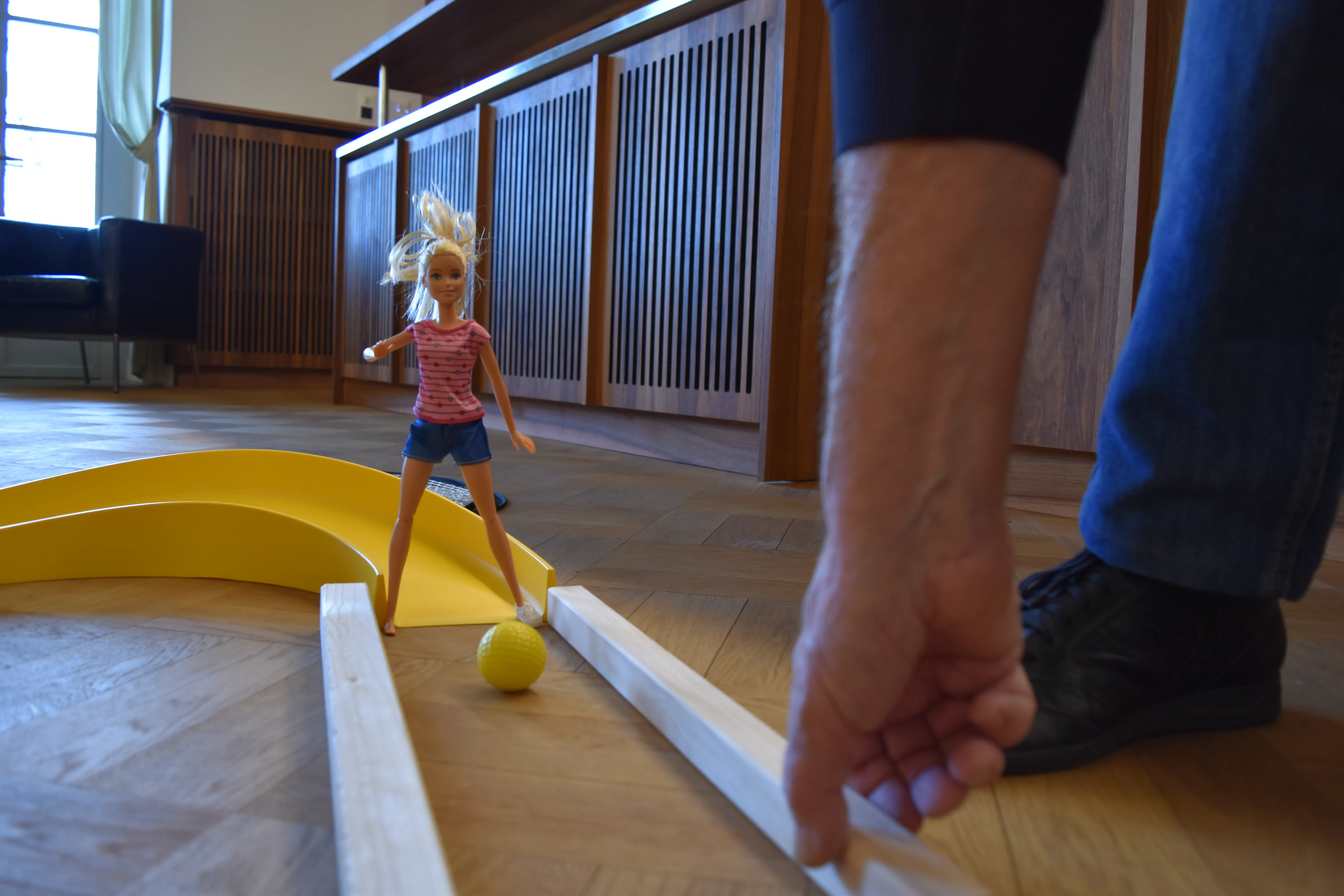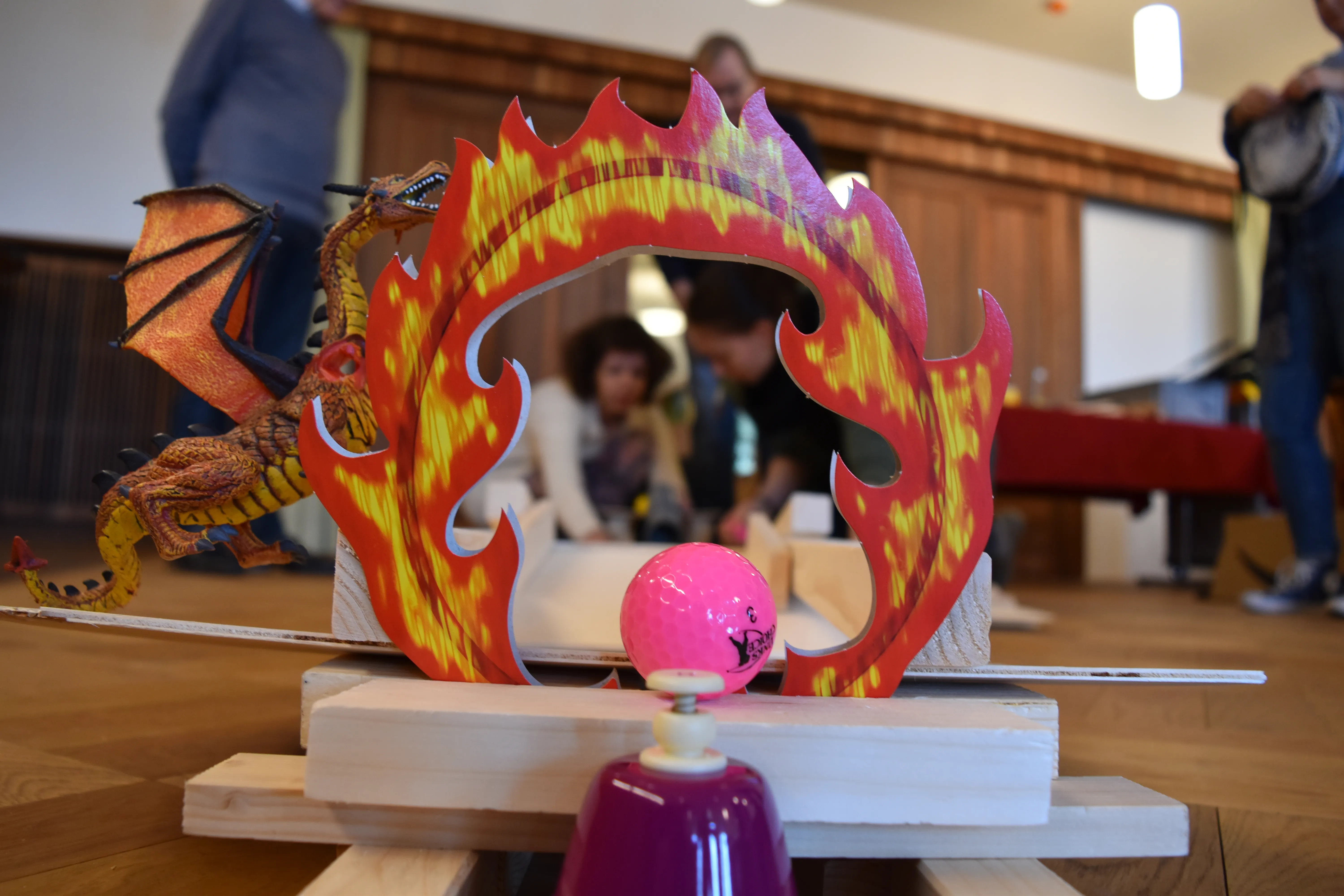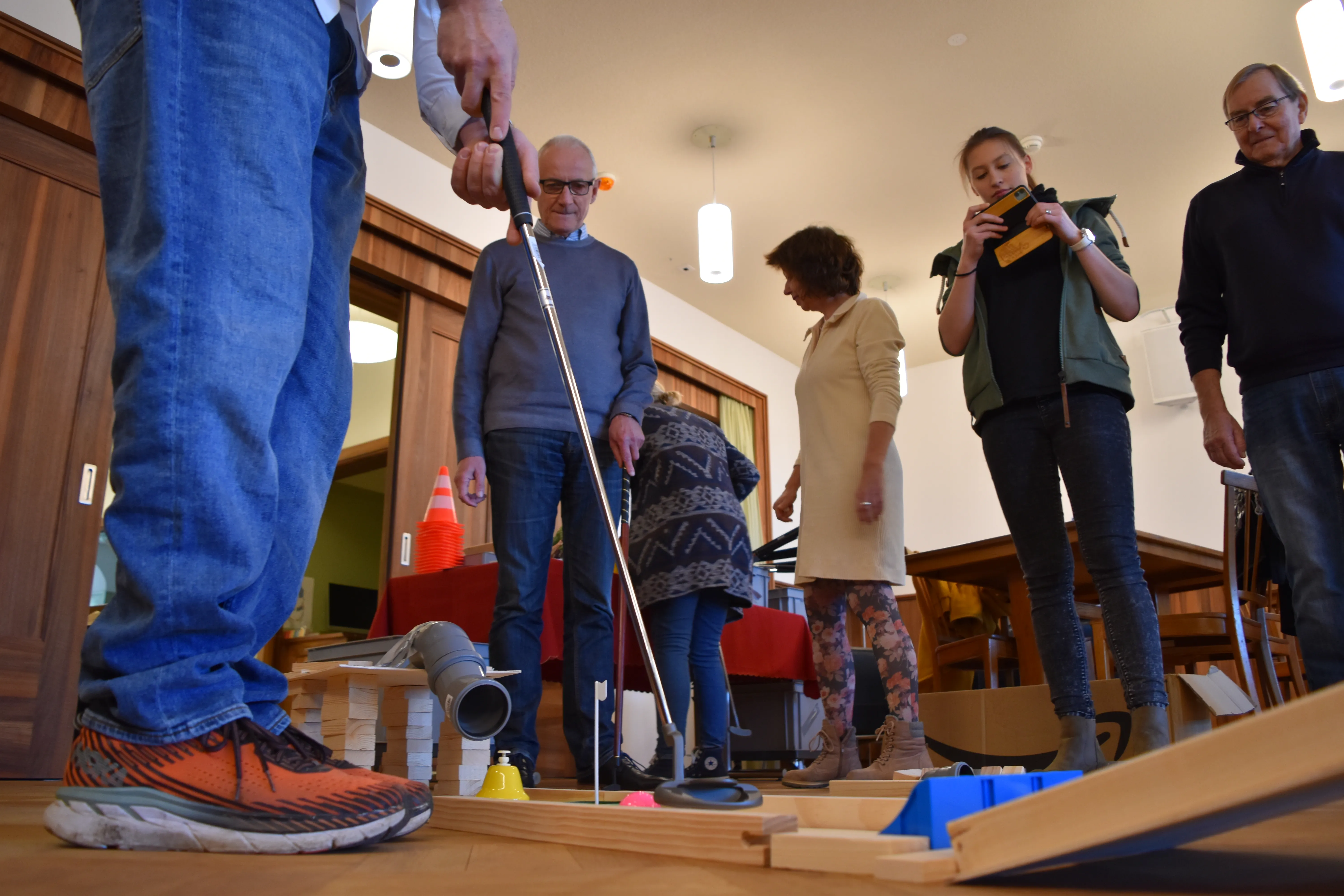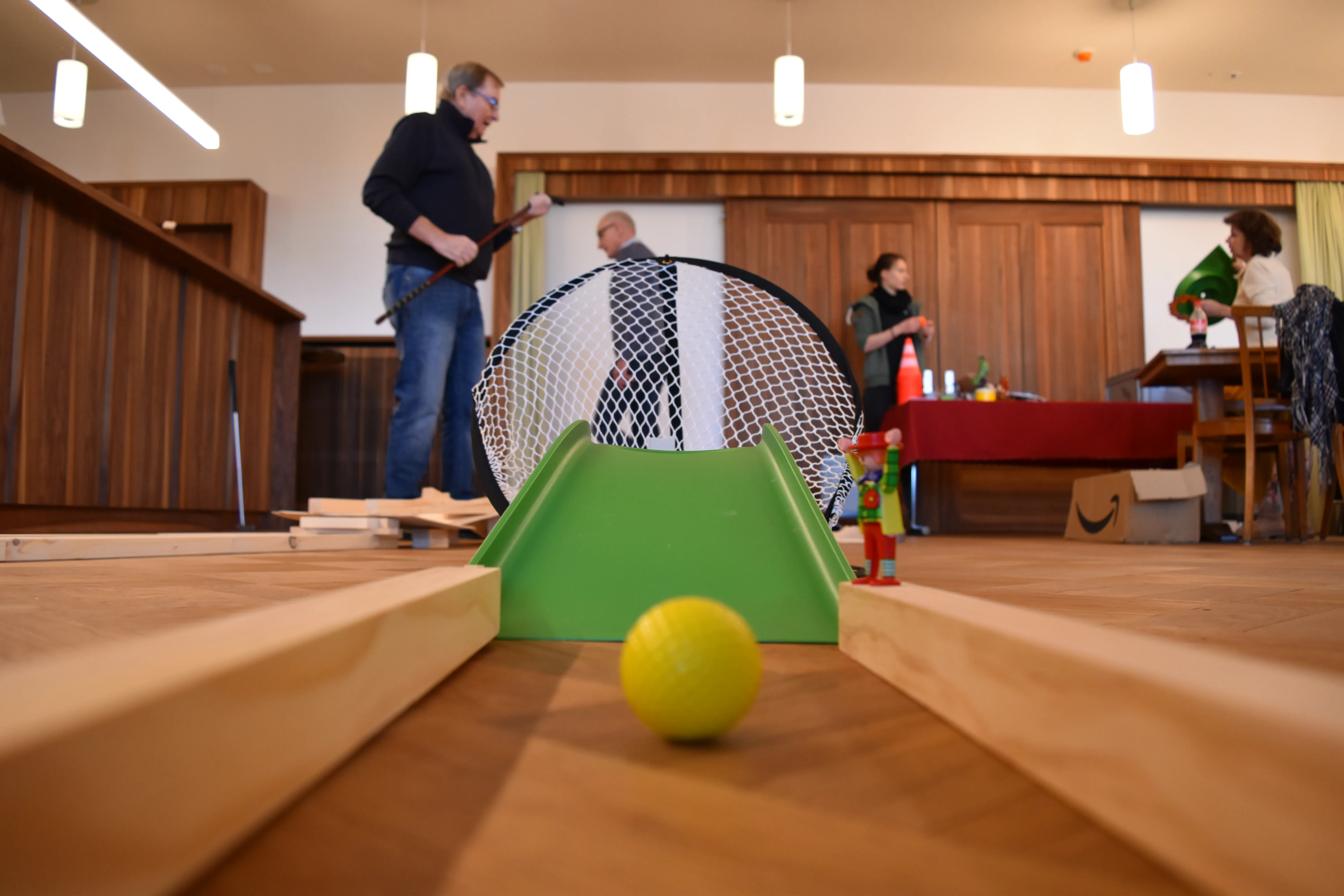 Nach dem Bau ist vor dem Minigolfspiel. Jetzt präsentiert jedes Team seine Golfbahn. Dann gilt's ernst, denn nun kommen die Bahnen erstmals durch die anderen Golfteams zum Einsatz.